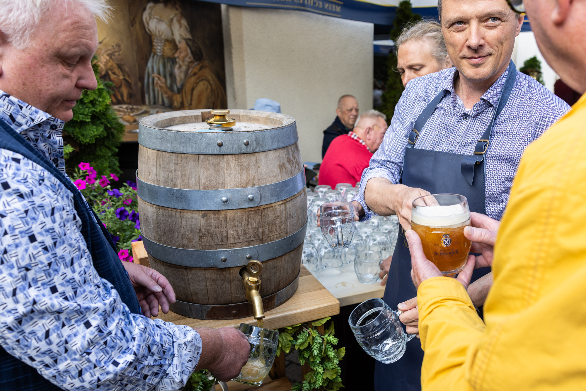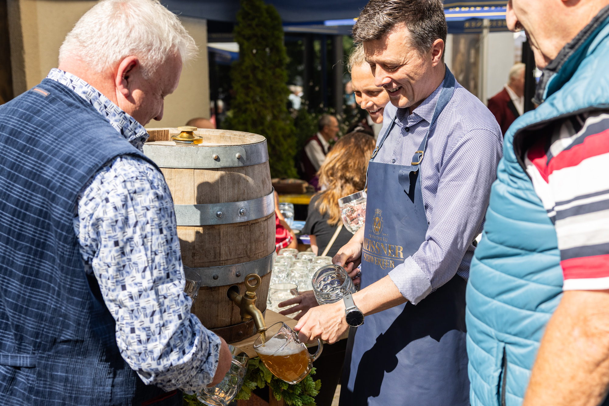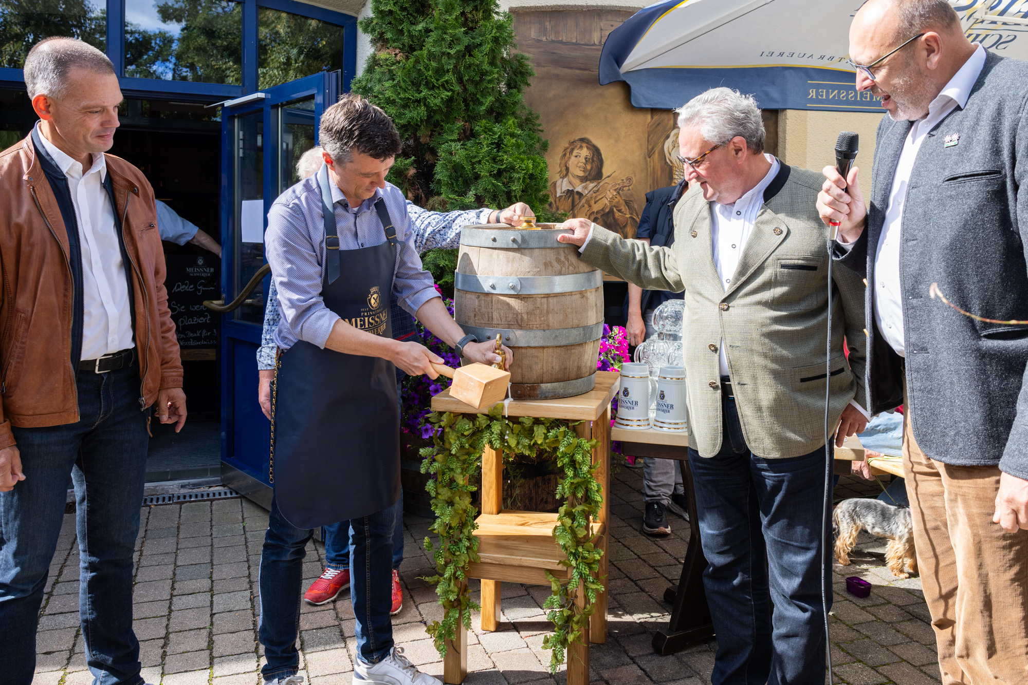 - Markus Renner am Weinfass auf dem Meißner Marktplatz zum Bürge